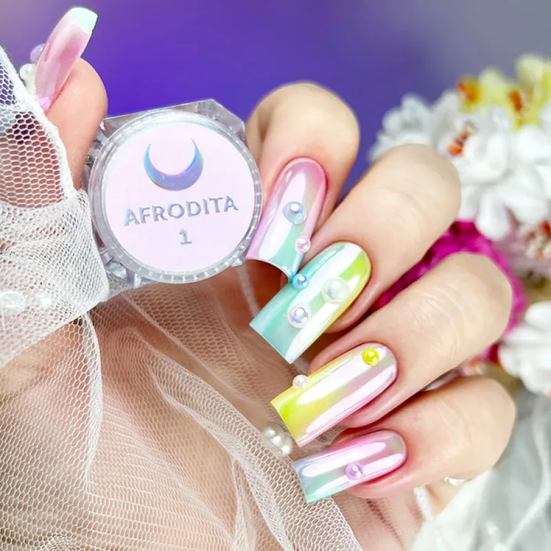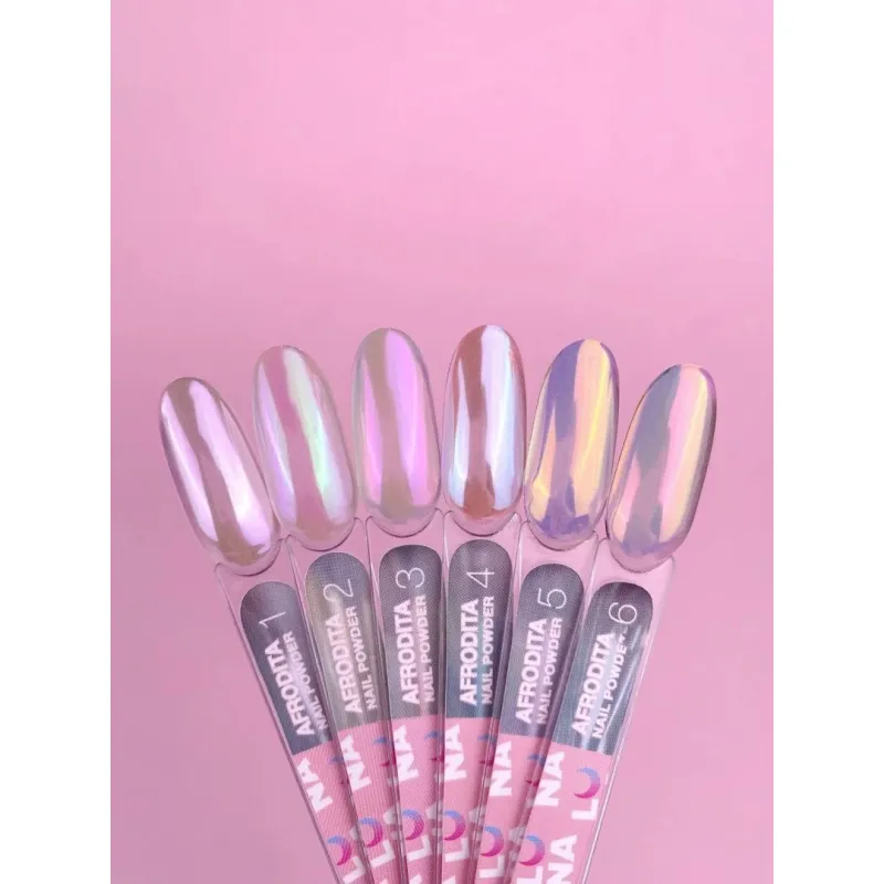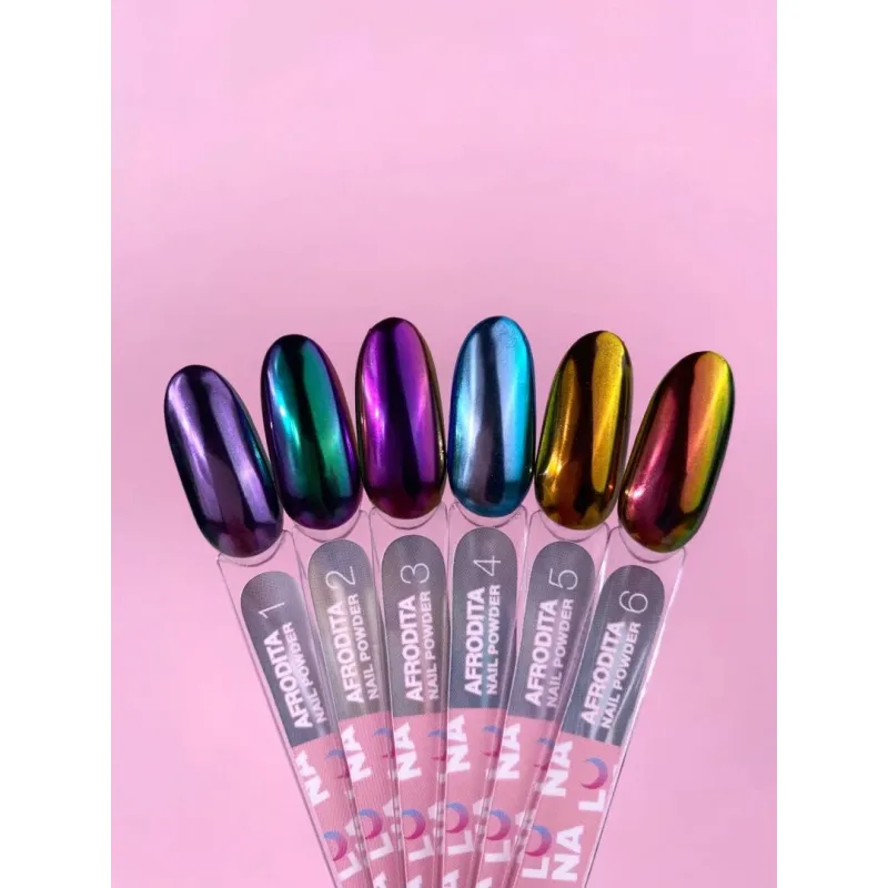 AFRODITA NAIL POWDER SET (6-PACK COLLECTION) is a premium, ultra-fine powder. It applies evenly and easily, providing flawless coverage without gaps or unevenness. It's perfect for both light and dark shades, creating a subtle shimmer on light colors and vibrant highlights on dark nails.