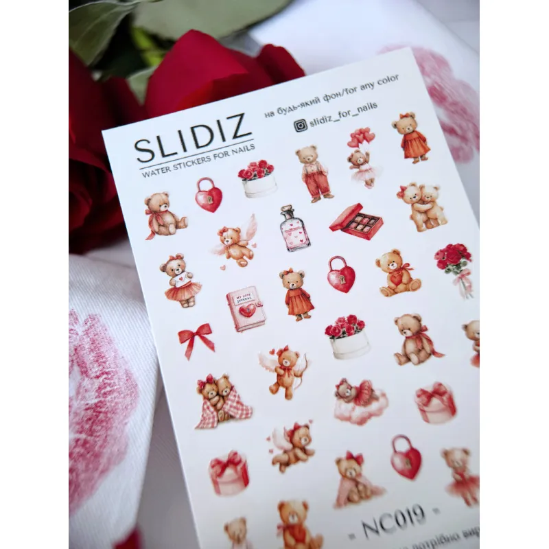 Slidery NC není třeba stříhat, jsou již zbaveny přebytečné fólie, fólie je pouze ve tvaru obrazu. Stačí jezdce nebo předřezanou skupinu prvků namočit na 10 sekund na vlhký hadřík. Pomocí štětce namočeného v gelovém základu tak, aby byl lepkavý, přeneste vzor na nehet. Takové jezdce se upevňují stejným způsobem jako běžné.